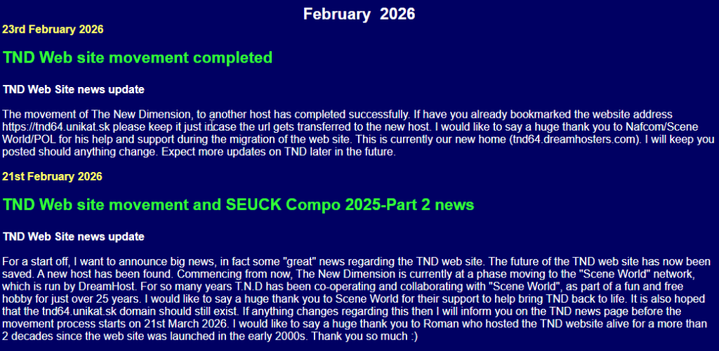 As Richard Bayliss/TND reported, his old webhost which was Roman aka CreamD of c64.sk, is about to close down, the folks of Scene World Magazine decided to give TND a new home as their webspace.